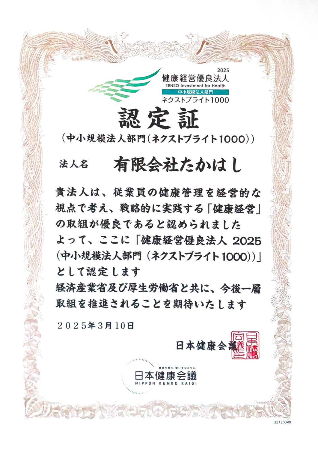 たかはしきもの工房2025-03-11 10:00:252025-10-03 17:00:55【表彰】「健康経営優良法人2025(中小規模法人部門(ネクストブライト1000))」に認定していただきました